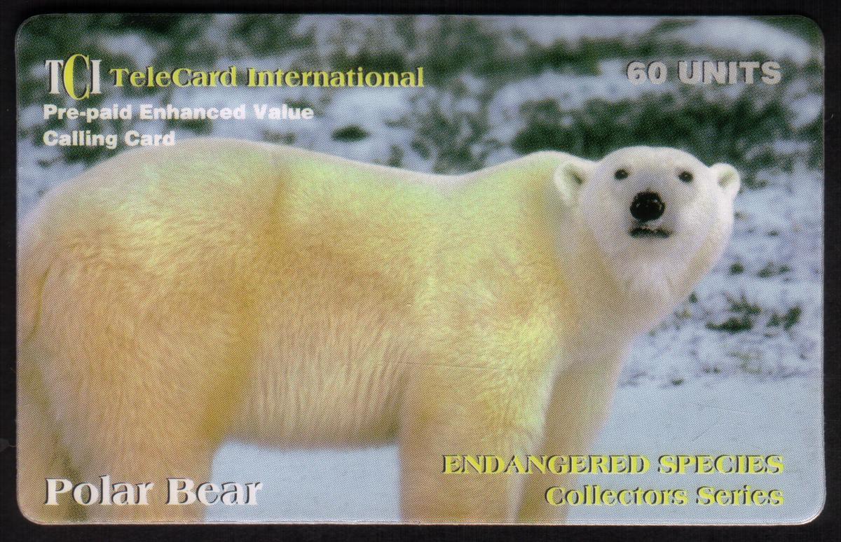 The card is part of the Collectors Series produced by TeleCard International Inc. It includes the text "60u Polar Bear Endangered Animal Species Collectors Series," highlighting the card’s value and its thematic dedication to endangered wildlife. The TeleCard International Inc logo is visible, confirming the card’s origin and collector’s nature. The design combines photographic realism with artistic framing to emphasize polar bears as important species in wildlife conservation.
