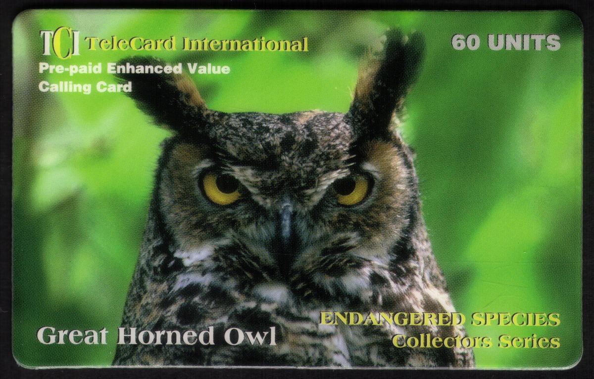 The card is marked with the denomination "60u" and bears the name "Great Horned Owl" along with the text “Endangered Animal Species Collectors Series.” It includes the logo and branding of TeleCard International, Inc. The overall design highlights the card’s focus on wildlife conservation and supports the theme of endangered animals. The layout includes clean typography and a natural color scheme that complements the owl’s plumage.
