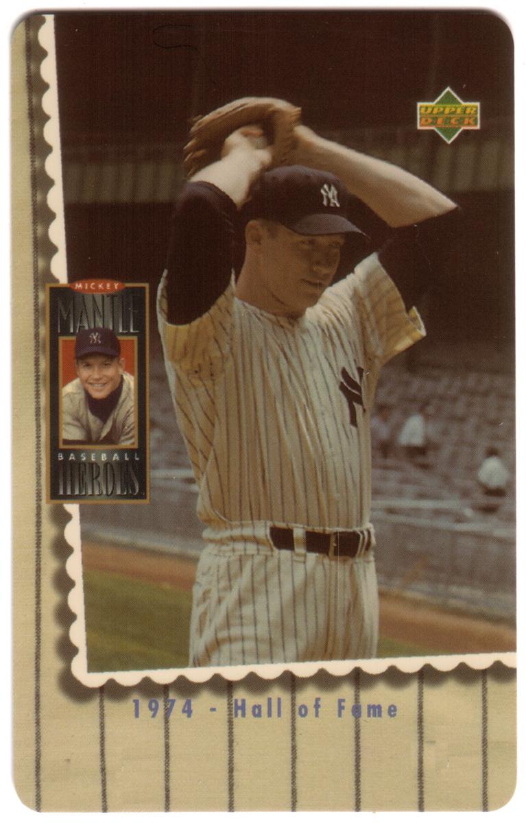 On the left side of the card, there is a smaller inset photo of Mickey Mantle wearing a Yankees cap, accompanied by the text "Mickey Mantle Baseball Heroes." The bottom of the card displays the text "1974 - Hall of Fame" printed in blue. The Upper Deck logo appears in the top right corner of the card.