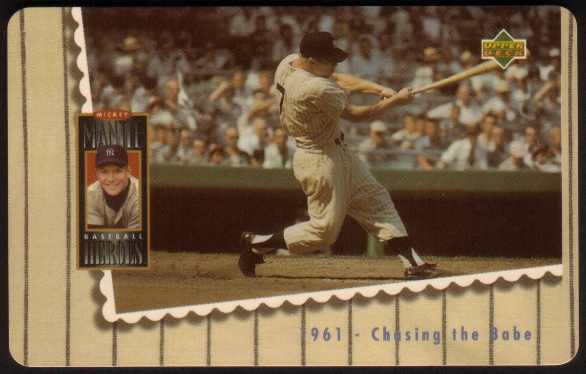 This collectible card features a detailed baseball theme centered around Mickey Mantle, one of Major League Baseball’s most iconic players. The card is titled "1961 Chasing The Babe," referencing Mantle’s pursuit of Babe Ruth’s home run record during the 1961 MLB season. The image captures an intense moment of Mantle batting, showcasing him in full uniform with a classic baseball helmet and gripping a bat. The upper deck logo is visible, emphasizing the card’s association with this well-known sports memorabilia brand.