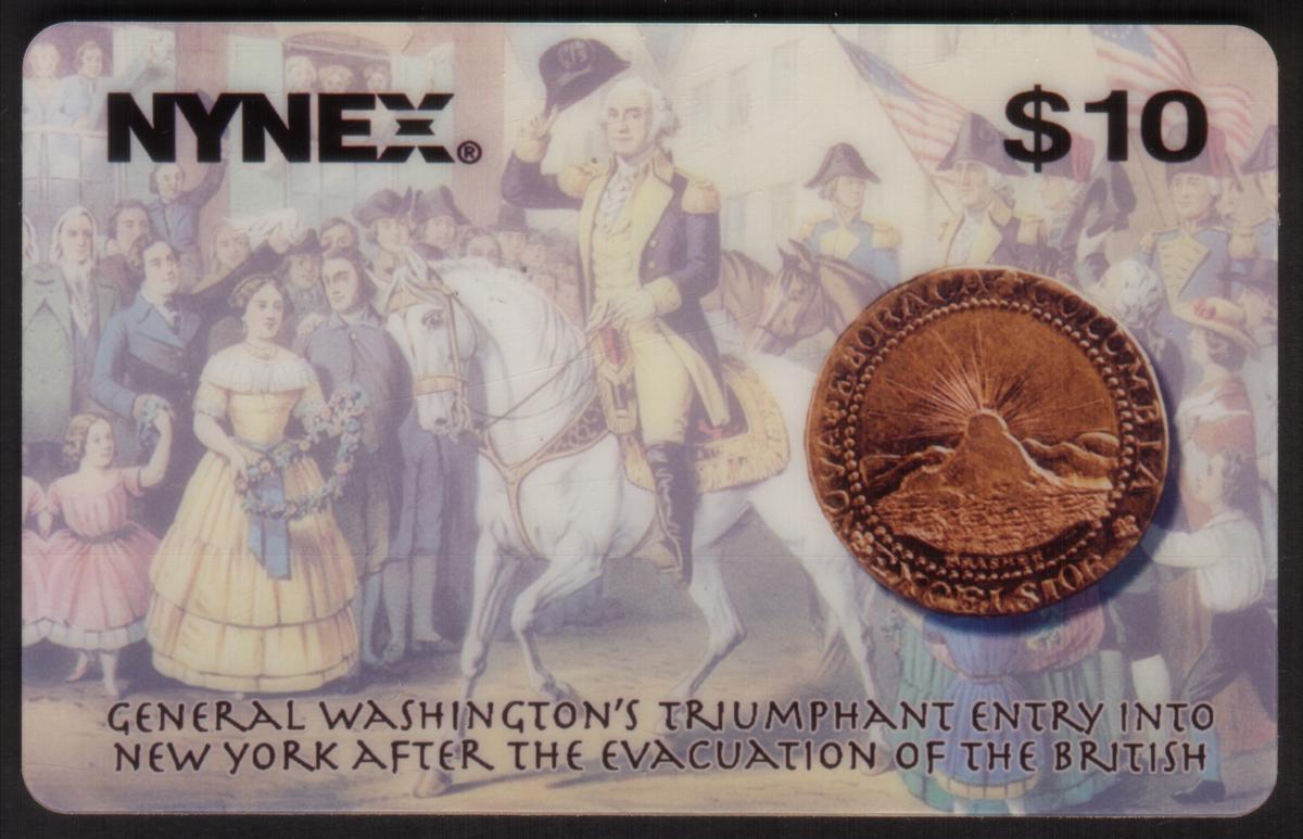 This NYNEX collectible phone card with a $10 denomination features an illustrated scene capturing General George Washington's triumphant entry into New York. Washington, dressed in his military uniform with a distinctive yellow coat and a black hat, is mounted on a white horse, positioned prominently in the center of the image. Behind him, soldiers in blue and white uniforms carry flags, while a crowd of civilians, including women and children in period clothing, enthusiastically applauds and celebrates his arrival.