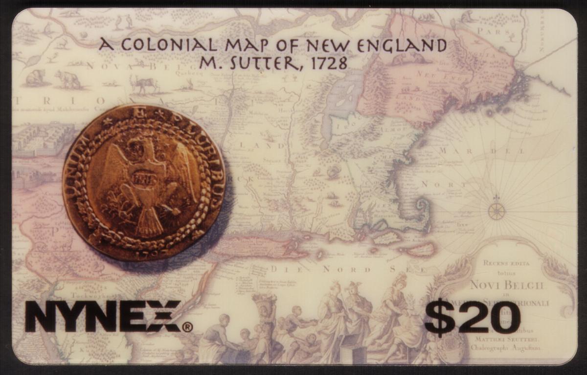 This collectible chip card celebrates themes of American history, rare gold coins, and the geography of the northeastern United States, specifically New England. It combines the fields of military numismatics and colonial cartography, making it a valuable item for collectors with interests in early American artifacts and historical cartographic representations.