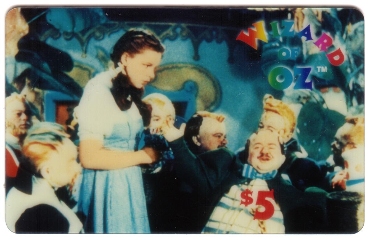 This collectible phone card features a colorful image from the classic film The Wizard of Oz. At the center stands Dorothy, dressed in her iconic blue gingham dress with a white blouse underneath. She is surrounded by the Munchkins, the small inhabitants of Munchkinland who are known for their distinctive bright costumes. The characters are arranged closely together in a cheerful group scene, capturing a moment from the movie’s portrayal of Oz.