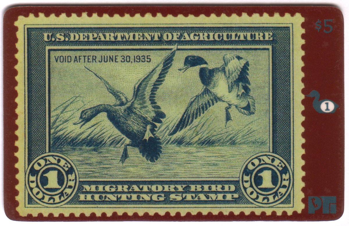 This card ties together themes of birds, wildlife, and duck hunting, as seen in the inclusion of the Mallard Ducks hunting permit stamp dated prior to 1935. It represents a piece of philatelic and hunting permit history, combined into a collectible prepaid international telecom card format.