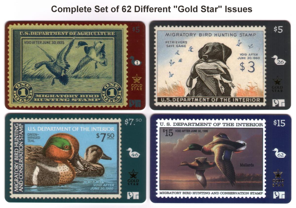 The phone cards are numbered sequentially from 1 through 62 along the right edge, each with a corresponding colored silhouette of a duck, numeric label, and the text "GOLD STAR" next to a star icon. The top right corner of every card shows a $5 denomination, except for some higher-valued cards marked $7.50, $10, $12.50, or $15. These cards are presented in varied color backgrounds and borders that complement the artwork and hunting stamp image. Collectors can see text such as “Migratory Bird Hunting Stamp,” “U.S. Department of the Interior,” and “Conservation Stamp” prominently displayed on the front of each card.