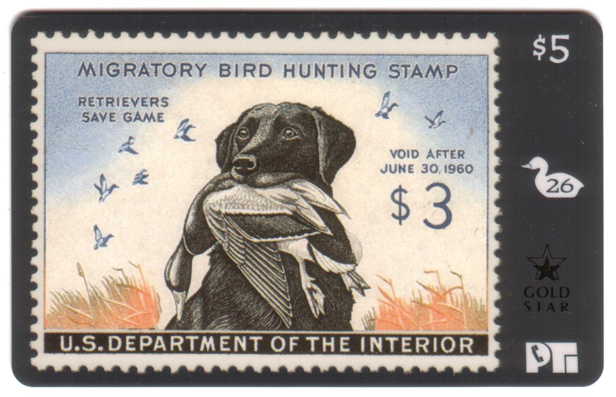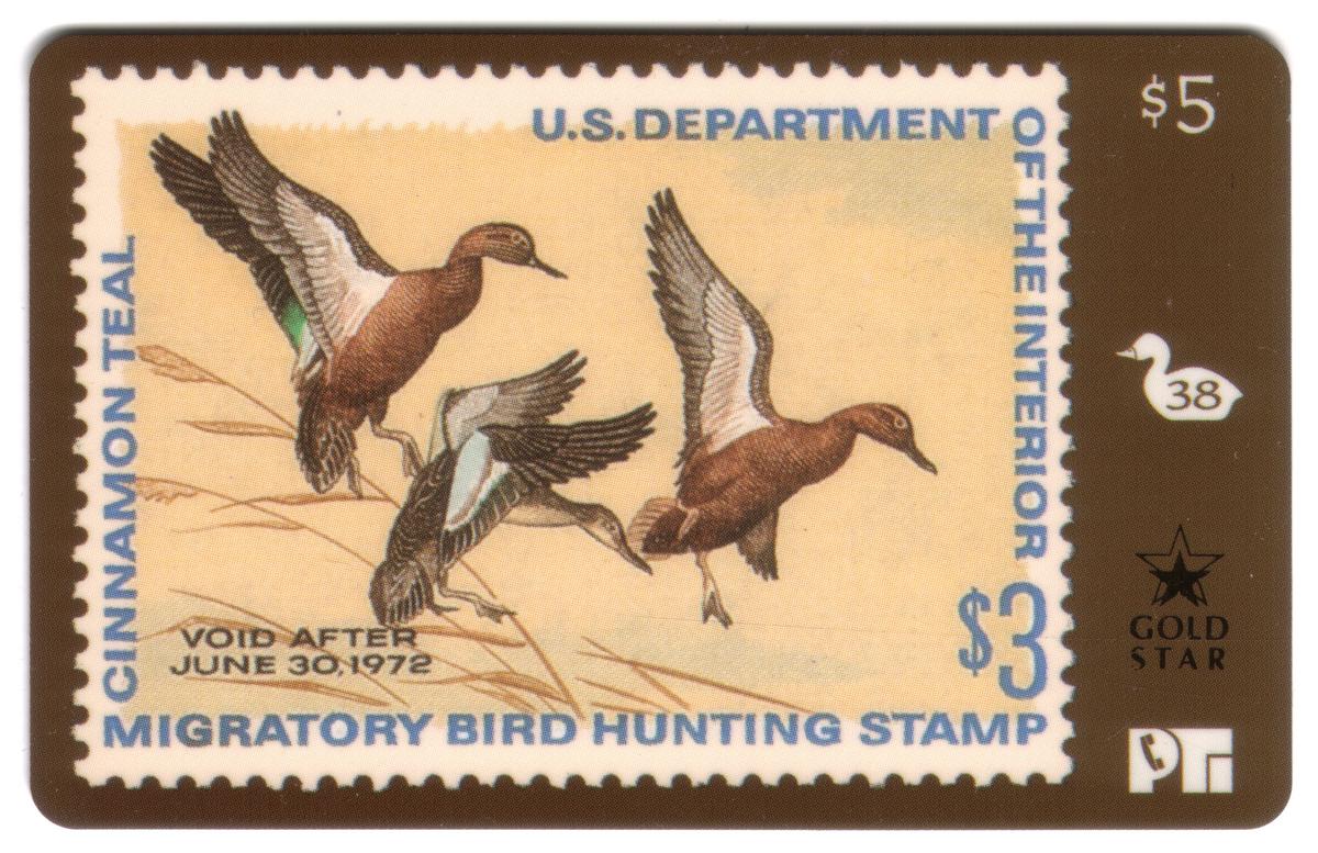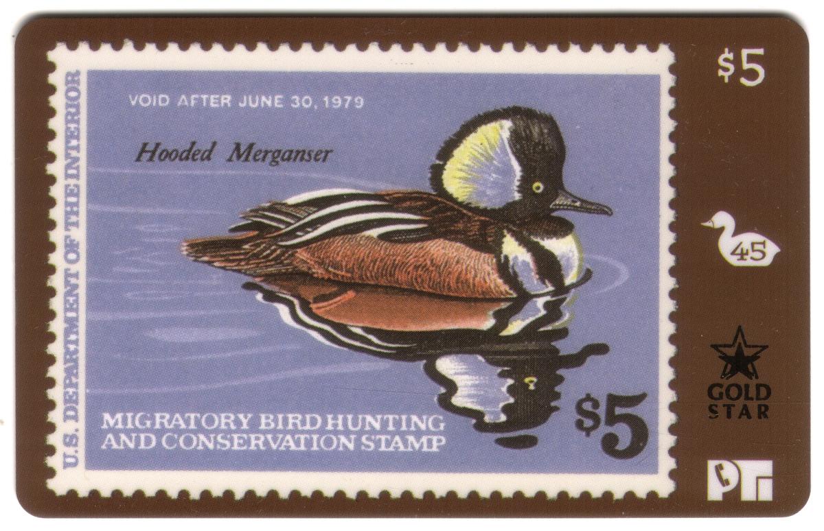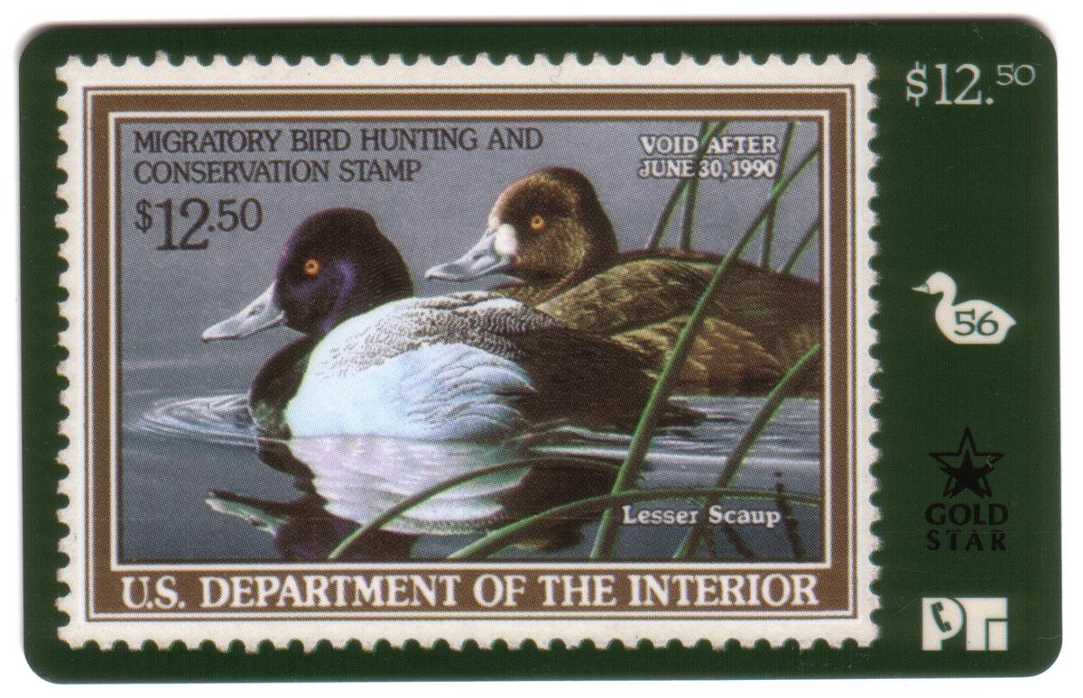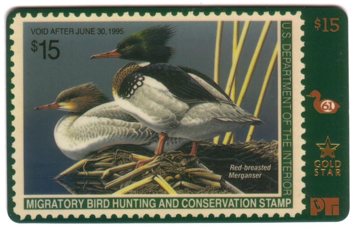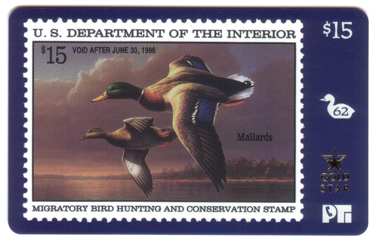 This complete set of 62 collectible prepaid phone cards features a series of Migratory Bird Hunting and Conservation Permit Stamps issued by the U.S. Department of the Interior and the U.S. Department of Agriculture. Each card displays a unique rendition of a vintage hunting stamp, showcasing various waterfowl species such as ducks, geese, mergansers, and swans. The designs range from detailed depictions of flying birds and water scenes to broods of ducklings and individual species like the Harlequin Duck, Blue-Winged Teal, and Wood Duck. Each hunting stamp includes a dollar value, a void date indicating the expiration of each permit stamp, and official departmental markings.