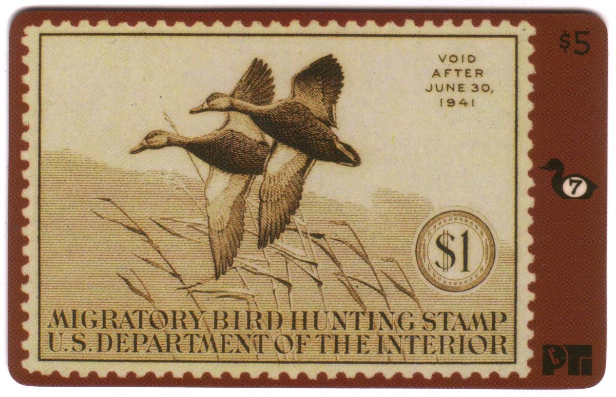 Text on the stamp reads "Migratory Bird Hunting Stamp U.S. Department of the Interior," with the note "Void After June 30, 1941" printed above the denomination, indicating the expiration date of this specific hunting permit. The card background is primarily a reddish brown color, with a $5 value printed in the top right corner. There is also a small black silhouette of a duck's head and a "7" in a circle near the right edge, corresponding to the Duck Hunting Stamp Card #7.