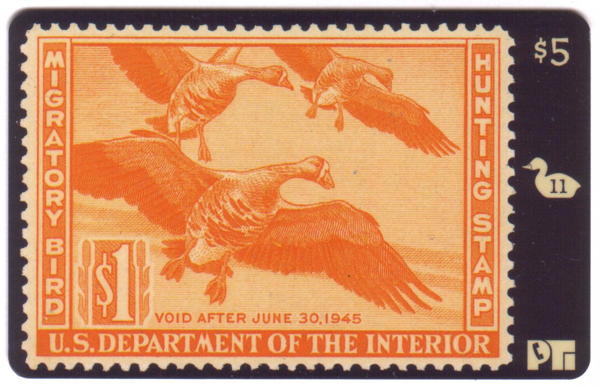The card combines elements of philately and wildlife conservation themes linked to hunting permits. It captures the historical issuance of duck hunting stamps while serving as a collectible prepaid telecom card with international utility.