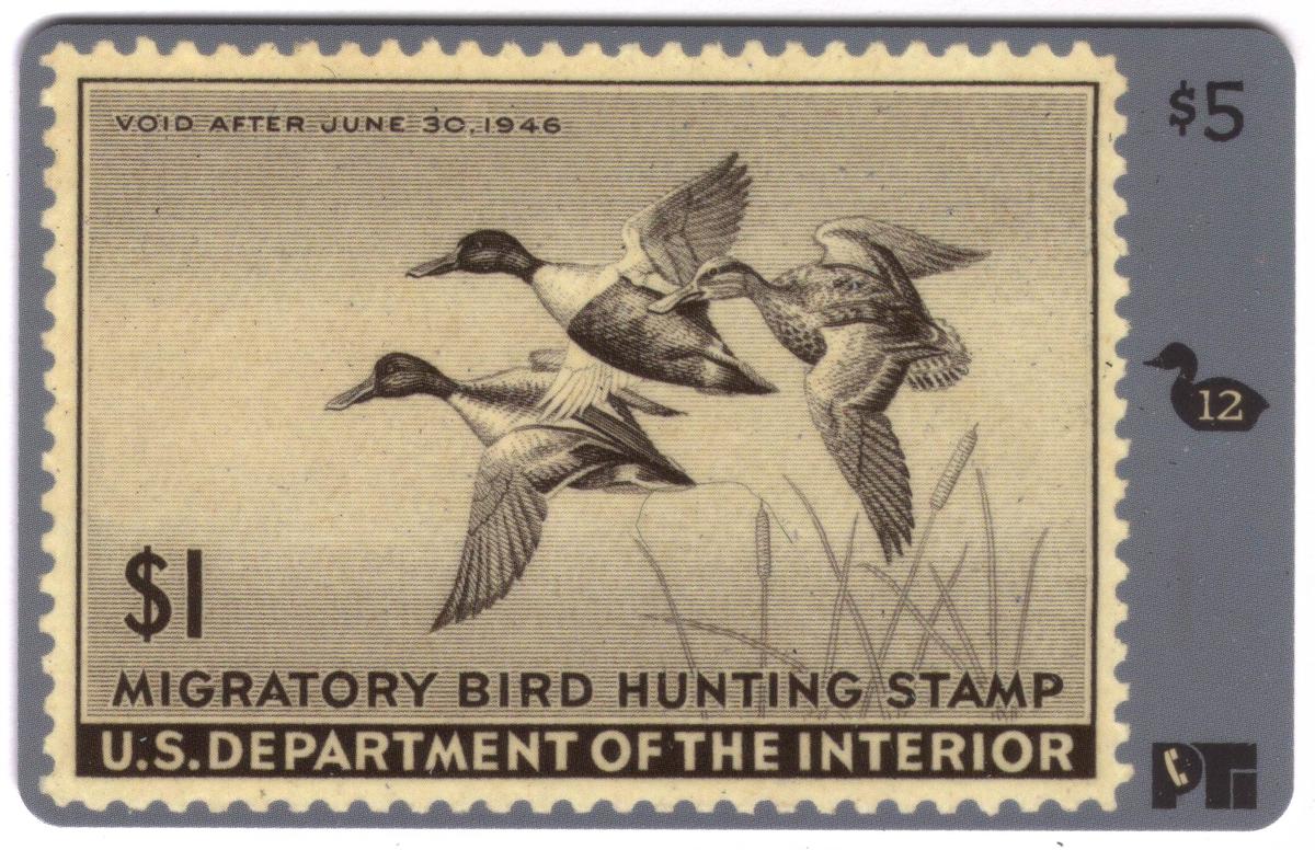 This collectible prepaid telecom card features an image of a 1946 Migratory Bird Hunting Stamp issued by the U.S. Department of the Interior. The stamp prominently displays an illustration of three northern shoveler ducks in flight over marsh reeds. The design includes detailed shading and fine line work in a sepia tone, showcasing the ducks with wings spread at various angles.