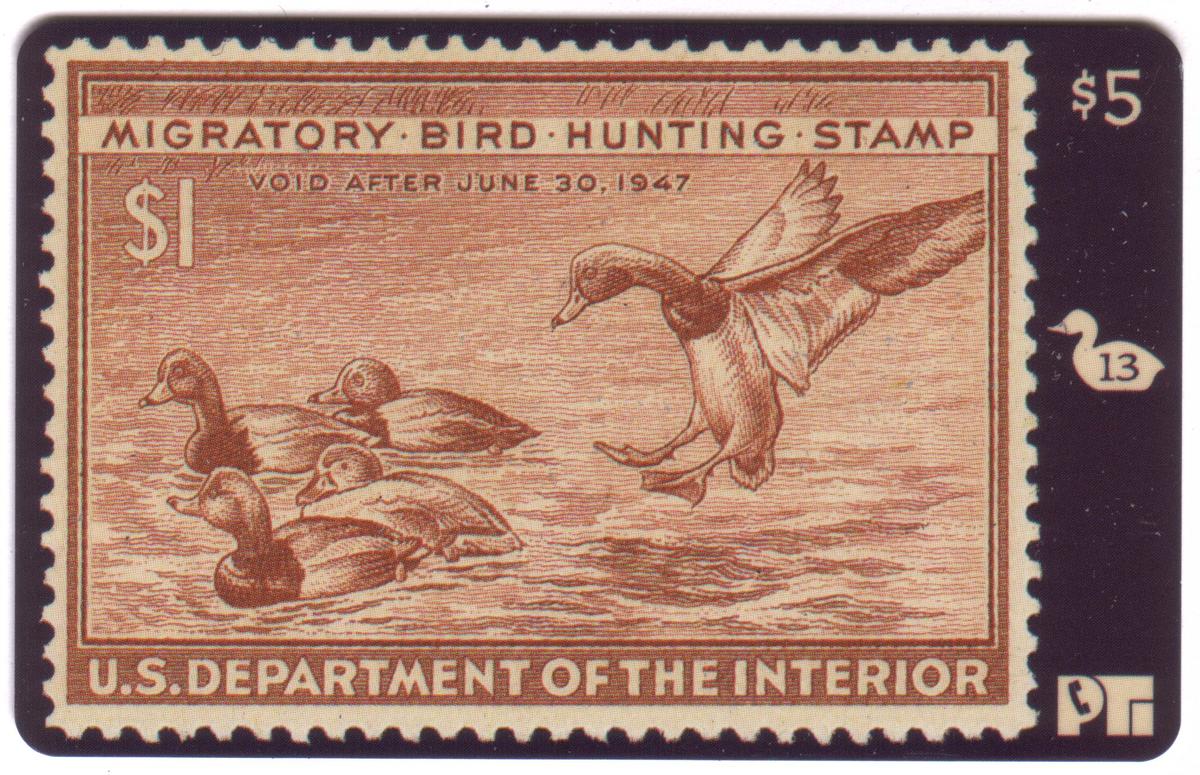 The overall card design includes a dark border on the right side with a white number "13" enclosed within a duck-shaped outline, and a "$5" value listed in the top right corner of this border area. This card is a prepaid telecom international collectible related to bird hunting, featuring important philatelic elements tied to duck hunting permits and migratory bird stamps.