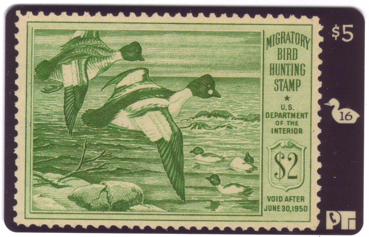 This Duck Hunting Stamp Card #16 was issued as a prepaid telecom card featuring the common goldeneye species. It is marked as used and is linked to hunting permits and collectible stamps, focusing on birds and wildlife. The card portrays a classic hunting permit stamp design authorized by the U.S. Department of the Interior.