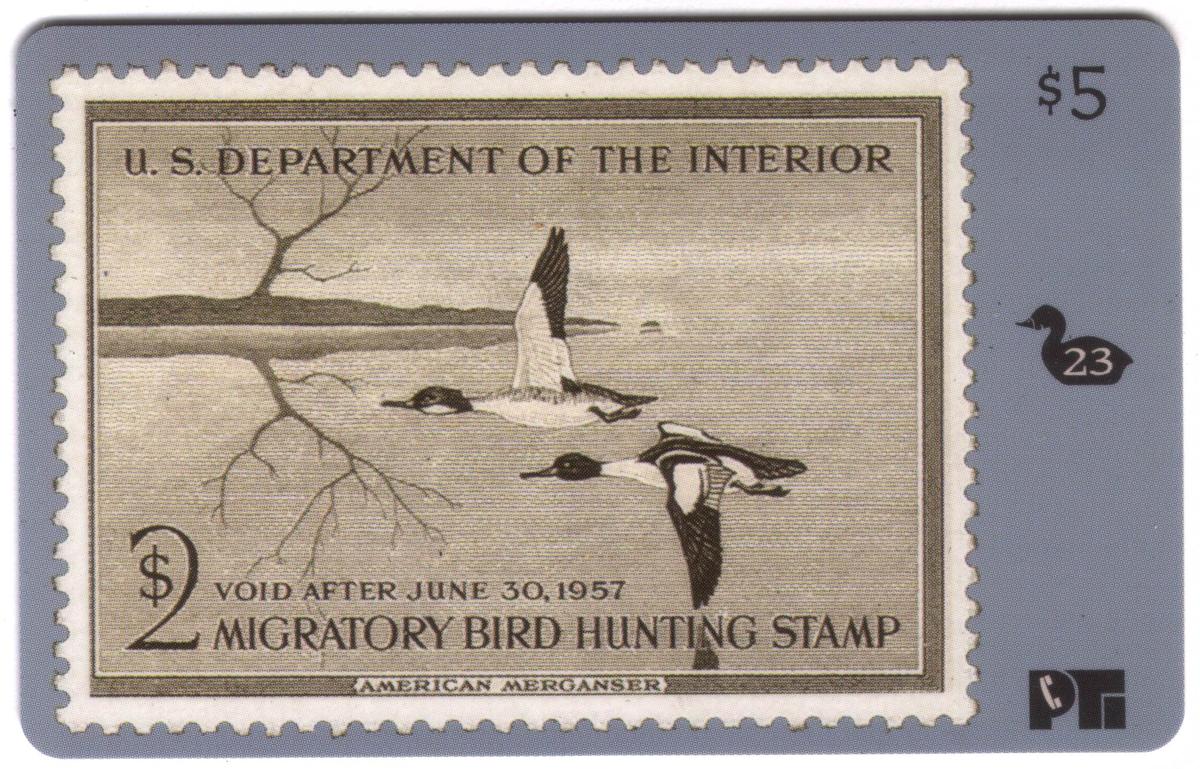 The image shows a collectible prepaid telephone card with a $5 value, issued by Telecom Intl. The front side features a detailed depiction of the "Migratory Bird Hunting Stamp" issued by the U.S. Department of the Interior. The stamp's central image displays two American Merganser ducks in flight over a body of water with tree branches and land in the distance, rendered in a muted sepia tone. The text on the stamp includes the phrases "U.S. Department of the Interior," "$2 Migratory Bird Hunting Stamp," "Void After June 30, 1957," and "American Merganser."