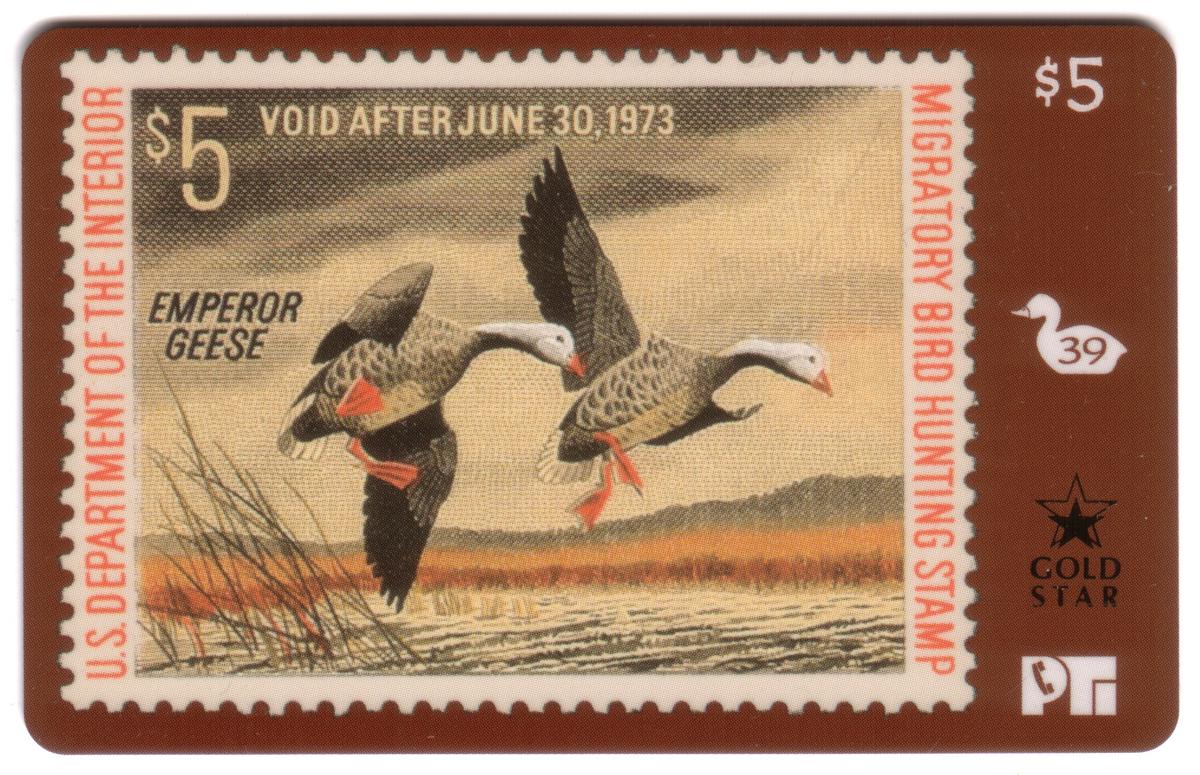 This collectible prepaid telecom card features the $5 Gold Star Duck Hunting Stamp Card #39 issued by the U.S. Department of the Interior. The stamp prominently displays a detailed illustration of two Emperor Geese in flight over a wetland landscape. The design includes natural elements like grasses and a distant shoreline under a cloudy sky, enhancing the wildlife hunting theme.