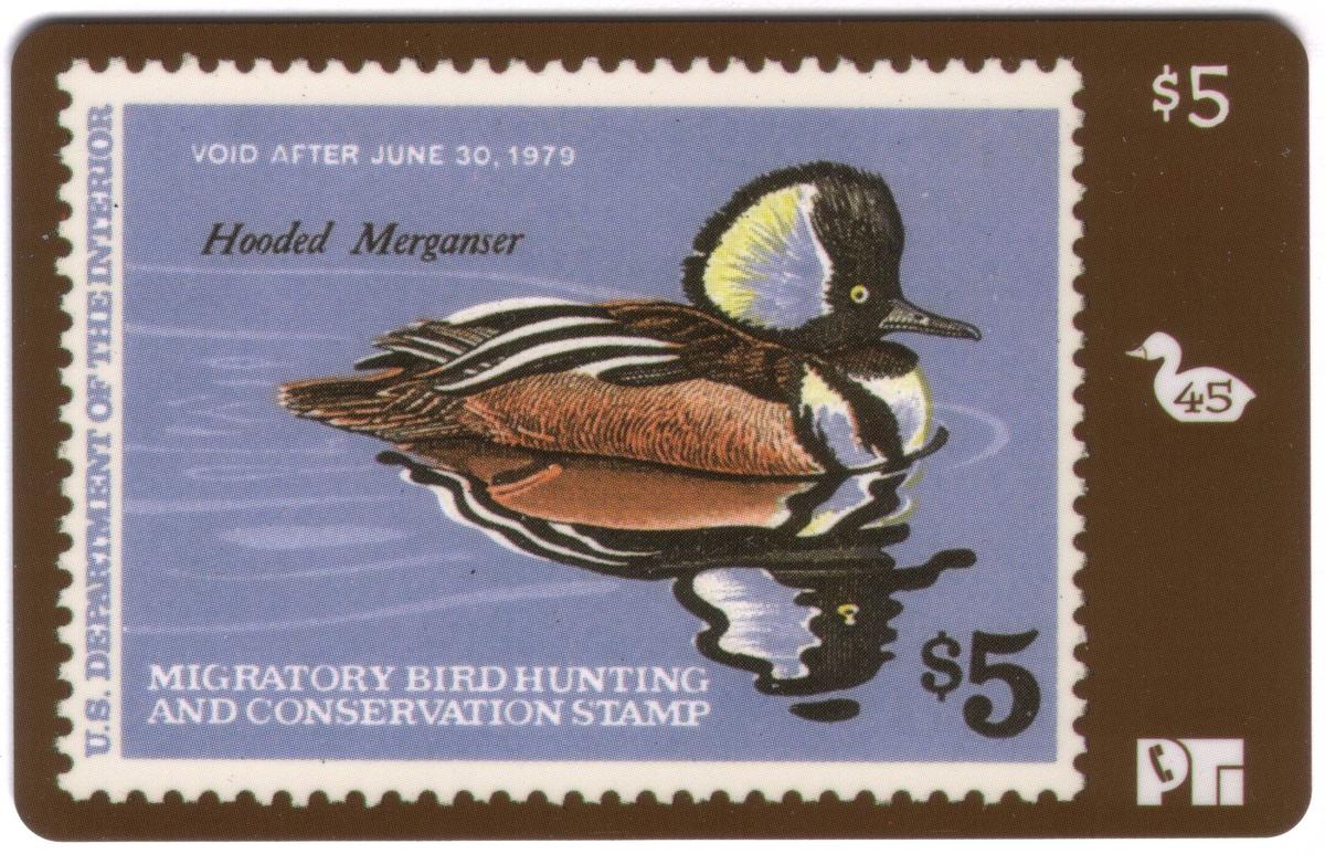 Text along the top left side of the stamp reads "VOID AFTER JUNE 30, 1979" and above the duck is the identification label "Hooded Merganser." Below the image, the stamp states the issuing authority as the "U.S. DEPARTMENT OF THE INTERIOR." At the bottom of the stamp, the denomination "$5" is shown in bold black font, along with the words "MIGRATORY BIRD HUNTING AND CONSERVATION STAMP."