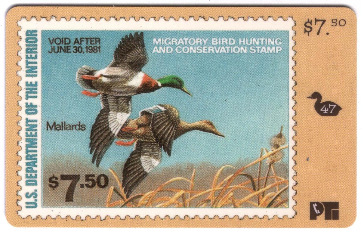 This collectible prepaid telecom card features the image of the Duck Hunting Permit Stamp #47 issued by the U.S. Department of the Interior. The stamp shows a detailed illustration of mallard ducks in flight over dry grass. The stamp includes the text "VOID AFTER JUNE 30, 1981," highlighting its period of validity. The background is a clear blue sky.
