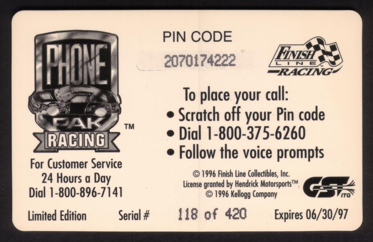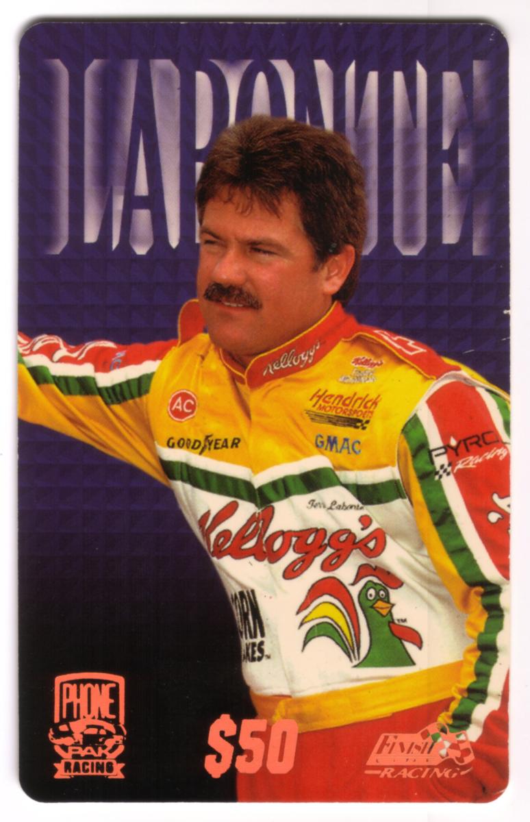 This phone card commemorates Terry LaBonte’s involvement in NASCAR within the mid-1990s and highlights the corporate sponsorships and branding associated with his racing career, including Kellogg's Corn Flakes and GMAC. The card’s design integrates racing themes with collectible phone card functionality, focusing tightly on the driver and his sponsors.