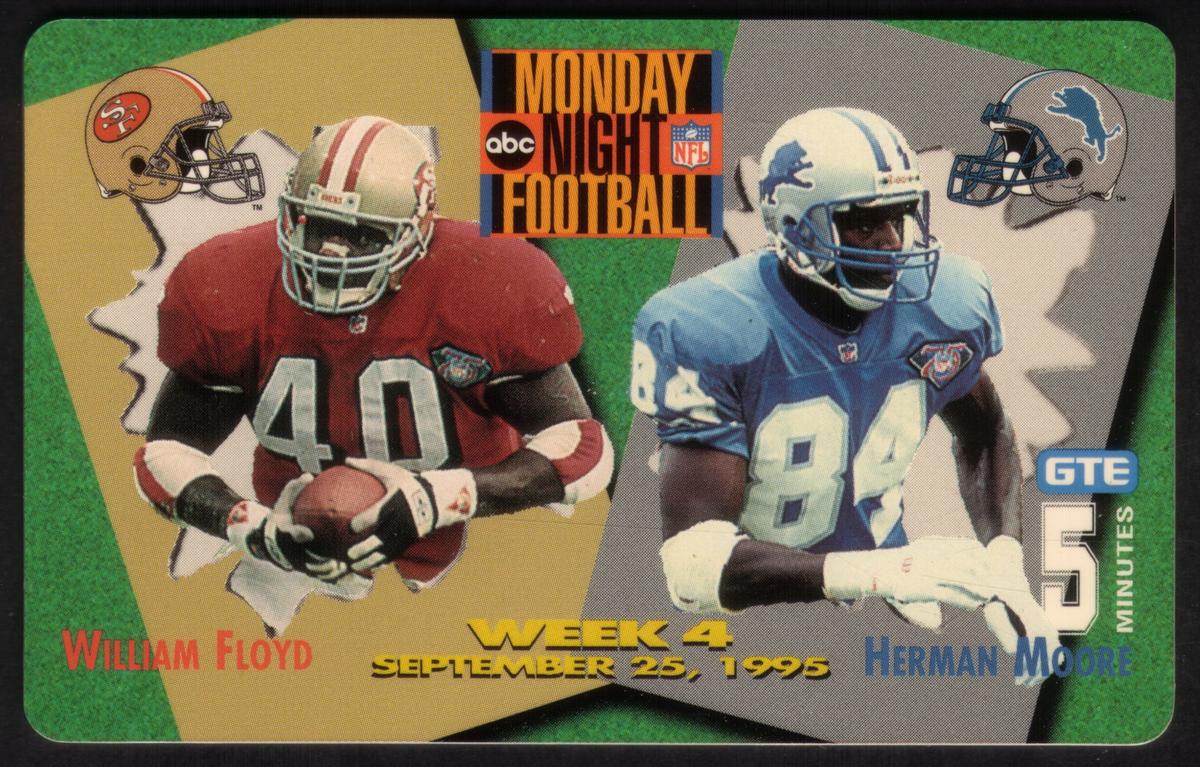 This collectible prepaid phone card features prominent NFL football players William Floyd of the San Francisco 49ers and Herman Moore of the Detroit Lions. Both players are depicted in their team uniforms, with Floyd wearing the red and gold colors of the 49ers and Moore in the Honolulu blue and silver of the Lions. The card highlights their association with Monday Night Football, emphasizing a matchup between the two NFL teams.