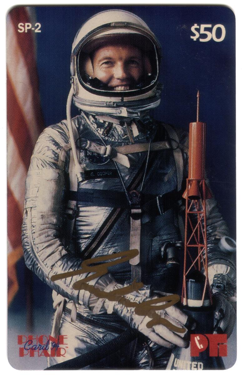This card is pre-paid and linked to Telecom International, making it both a collectible and functional telecommunications card. It carries a $50 value, which is clearly marked. The combination of the autograph, COA, and official NASA imagery makes this card a significant piece for collectors interested in space history, especially those focused on the achievements of NASA astronauts such as Gordon Cooper.
