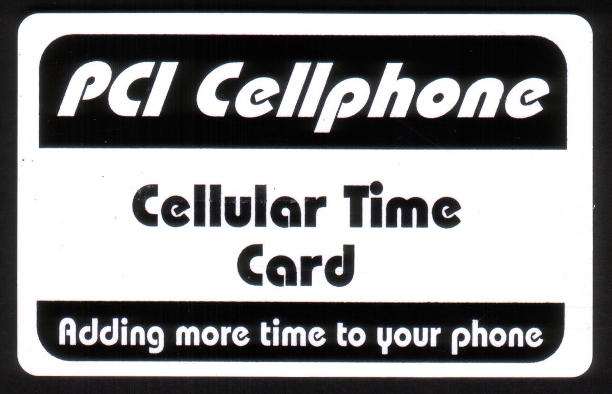 The card displays clear, bold typeface emphasizing its function for adding more time to a cellular phone, reflecting early usage in cellular phone technology. The text "PCI Cellular," "User Card," and "cell phone" also appear, specifying its application with cellular phones. The card design is minimalistic with no images or logos other than the textual information describing its use as a prepaid time card for cellular phone service.