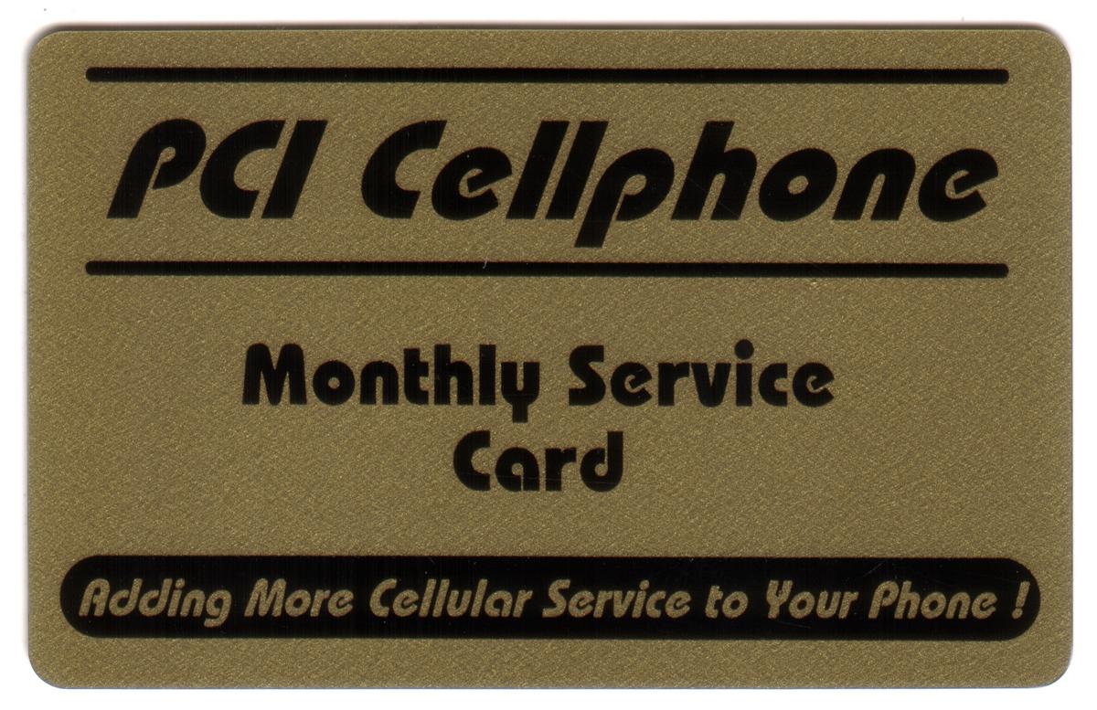 This collectible PCI Cellphone Monthly Service Card features a golden background with bold, black lettering. The top of the card displays the text "PCI Cellphone" in a large, stylized font. Beneath this, centered on the card, are the words "Monthly Service Card" in a simple, clear typeface. At the bottom, enclosed within a rounded rectangular black border, the card reads "Adding More Cellular Service to Your Phone!" in a playful, italicized script.