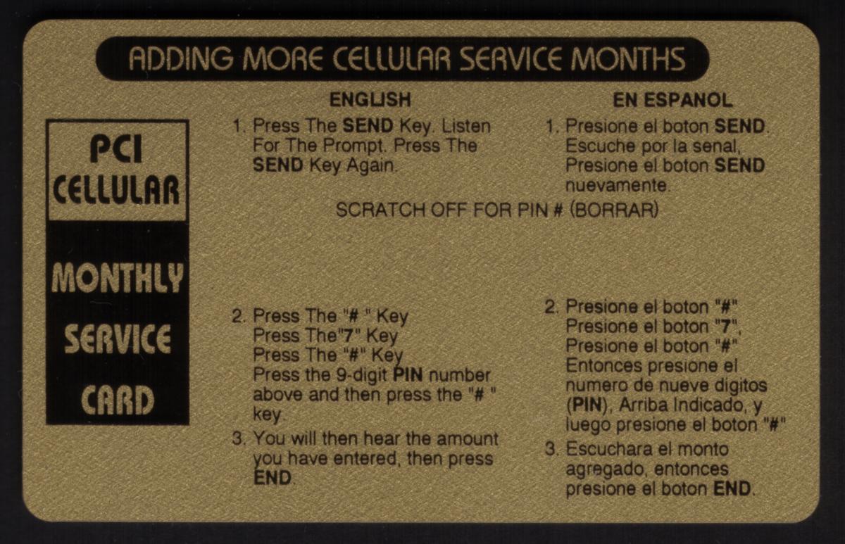 The card is marked as expired and inactive, and it is identified as a specimen. It is an early user card related to cellular phone technology, specifically designed to add more cellular service months to a phone. The overall design is straightforward, with a focus on the text and service information. The card is associated with PCI Cellular.