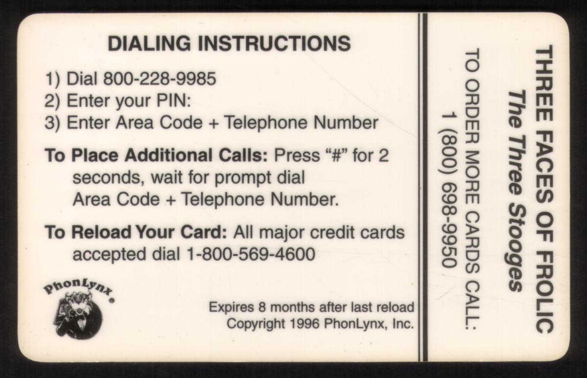 Vintage black-and-white card featuring The Three Stooges in a classic stacked pose with a $10 value, combining nostalgic imagery and phone service functionality. |