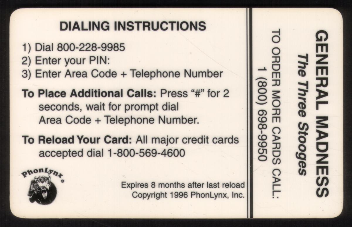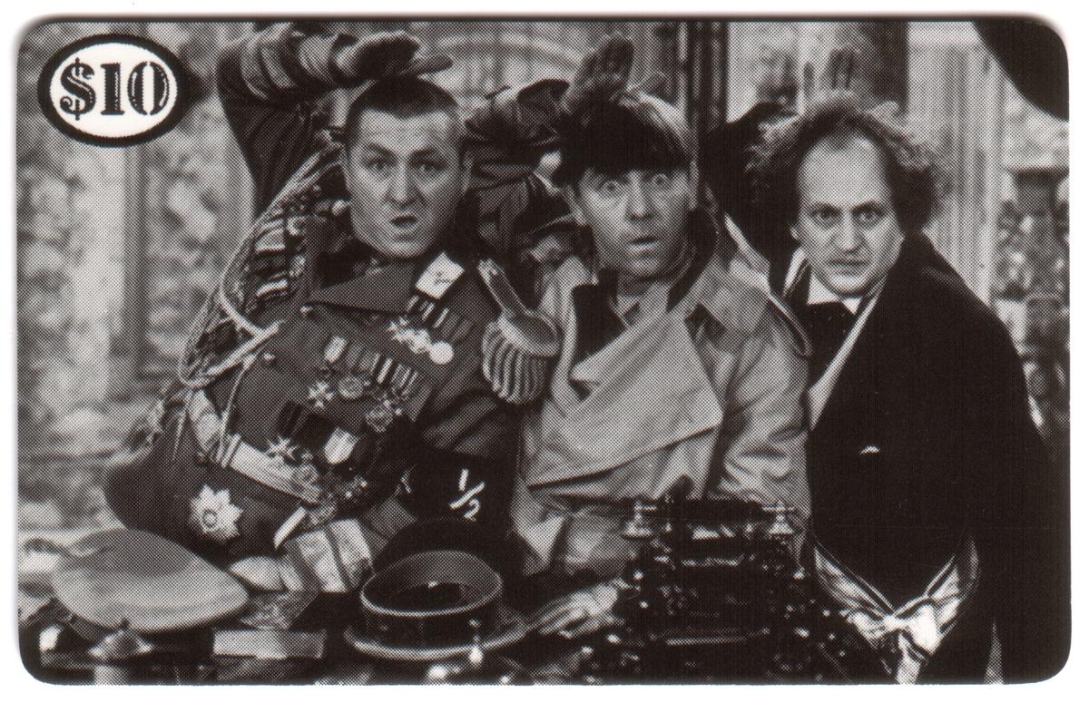 Vintage black-and-white Three Stooges phone card with $10 value, featuring Moe, Larry, and Curly in classic comedic poses from the 1930s-1950s era. |