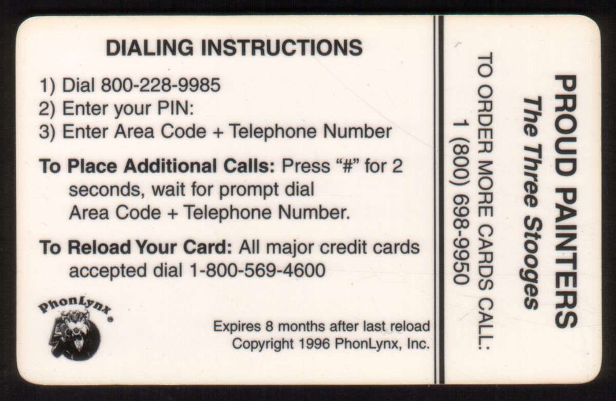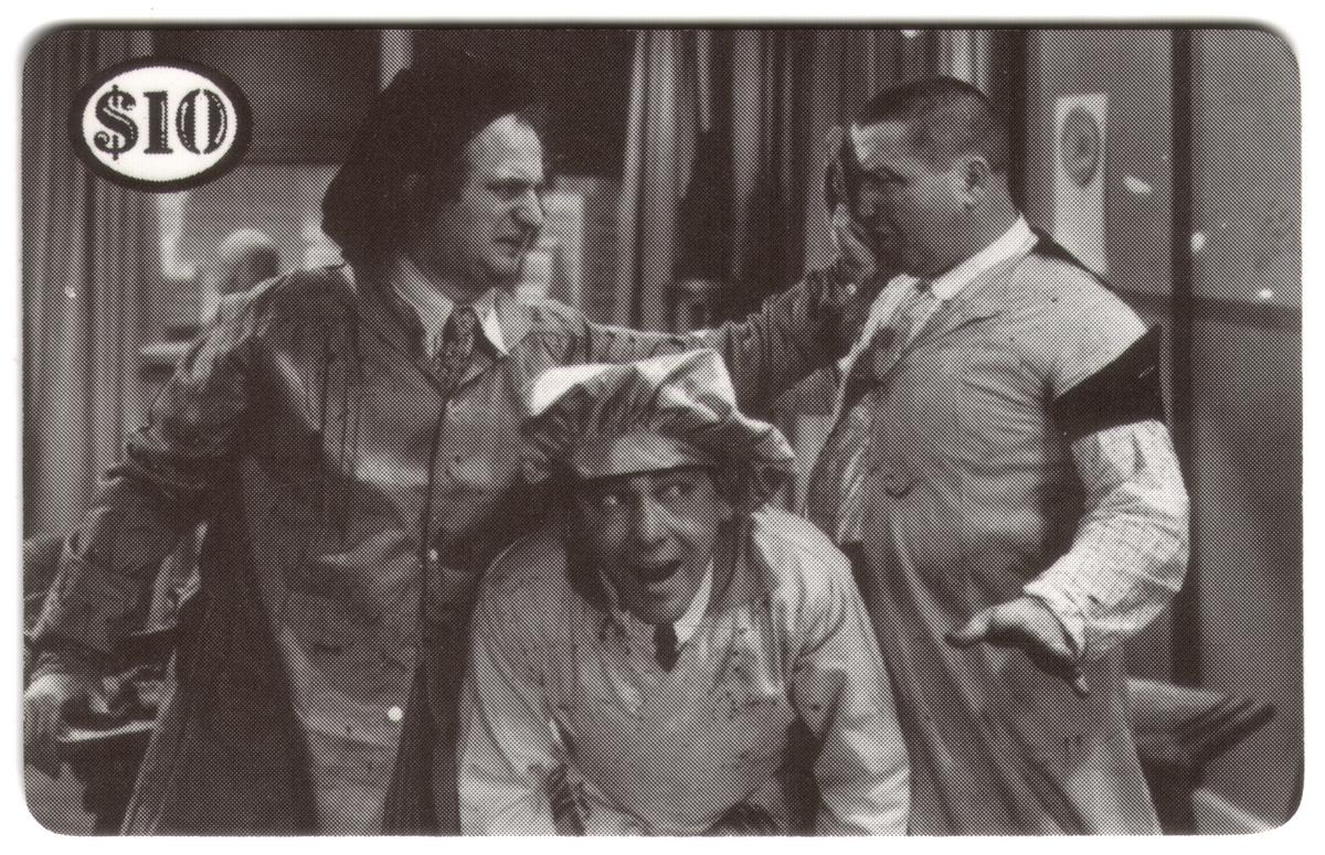 Vintage black-and-white Three Stooges phone card featuring Larry, Moe, and Curly in humorous chaos, with a functional back for calling use. |