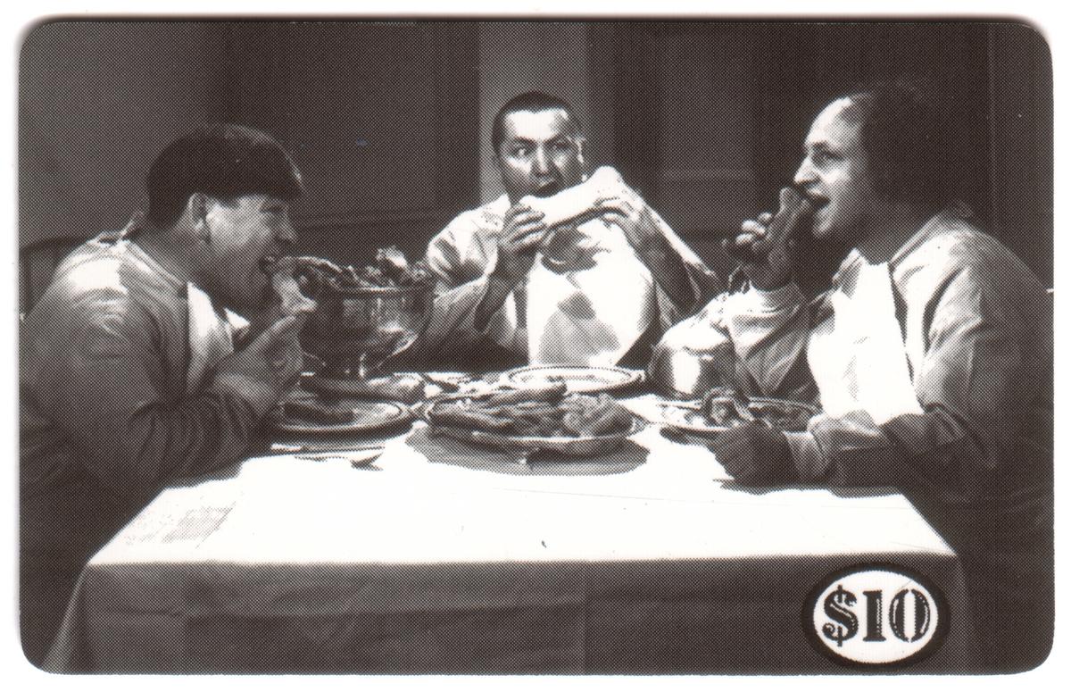 Black-and-white photo of The Three Stooges enjoying a chaotic meal, celebrating classic comedy and Hollywood legacy on a $10 collectible phone card. |