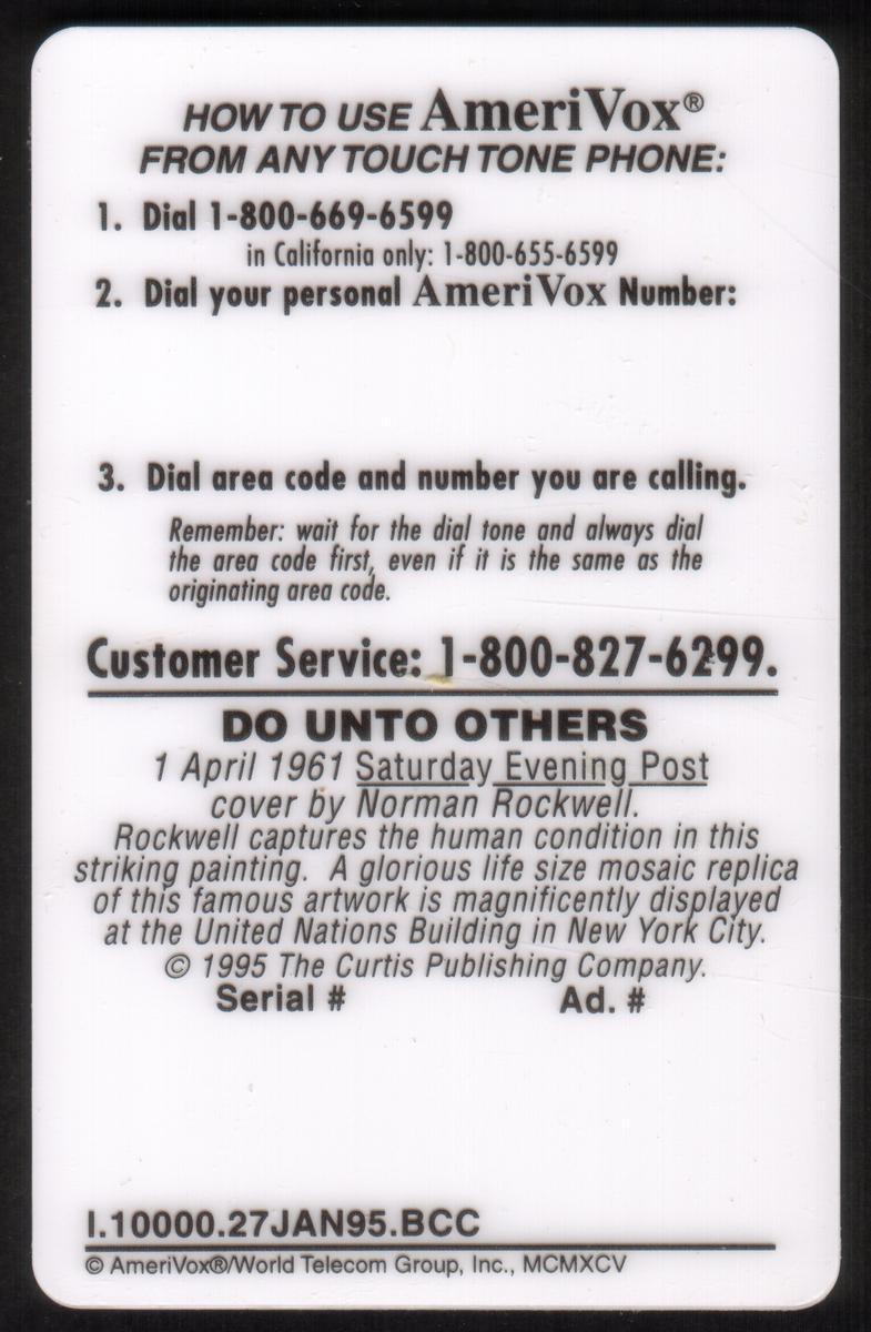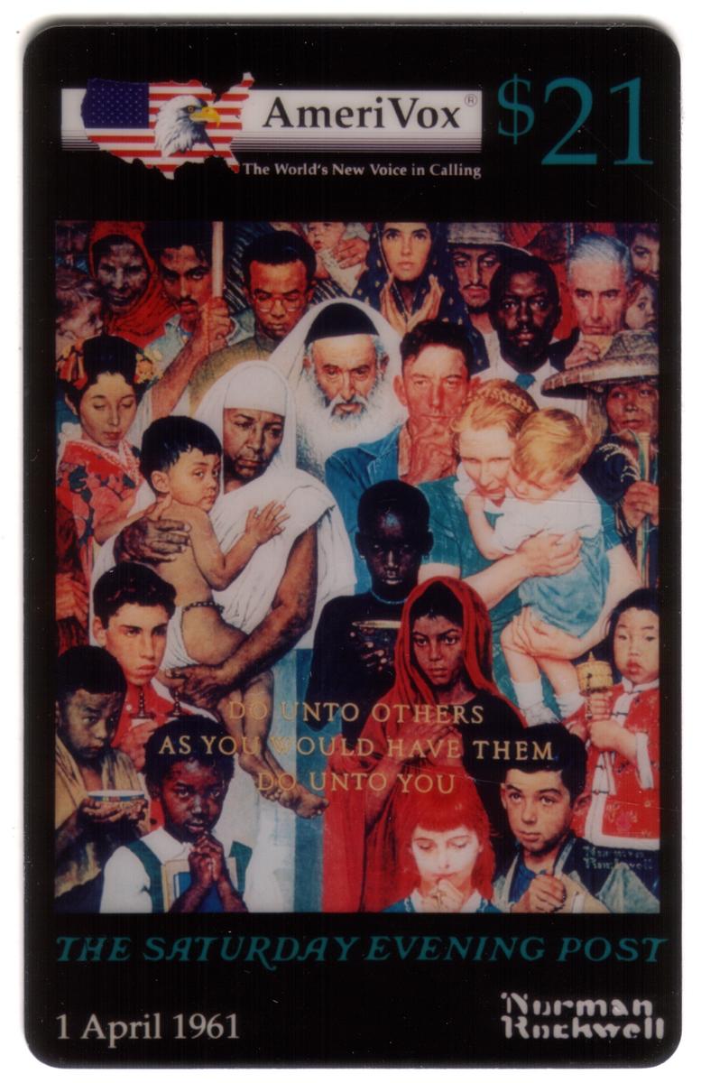 This collectible AmeriVox card, valued at $21, prominently features the artwork "Do Unto Others As You Would Have Them Do Unto You" by Norman Rockwell. The image shows a diverse group of children and adults from various ethnic and cultural backgrounds, gathered closely together, embodying a message of unity and kindness. The figures include boys, girls, and adults, some with hands together in prayer or contemplation, illustrating a powerful theme of compassion and understanding.