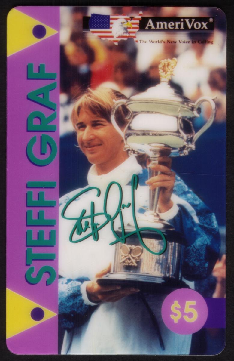 The card includes printed text identifying Steffi Graf as a tennis champion. Additional text references the Australian Open, one of the major tennis championships. The card’s design incorporates the AmeriVox name, signifying the issuing or producing company, and a $5 denomination is clearly visible.