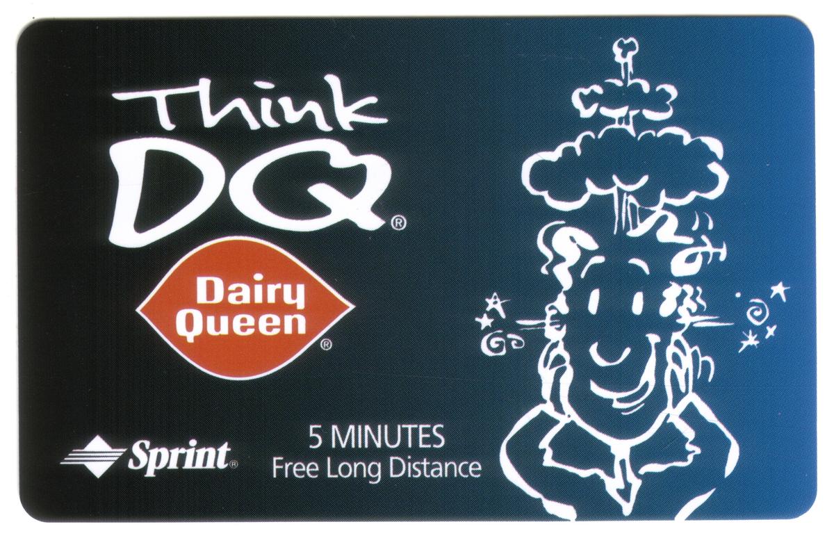The card prominently displays the Dairy Queen logo and includes the slogan "Think DQ," tying it directly to the Dairy Queen brand. The text "5m Dairy Queen 'Think DQ' Promo" indicates the card’s promotional use and its value of 5 minutes for phone calls. The Sprint logo appears on the card as well, referencing the telecom provider associated with this phone card.
