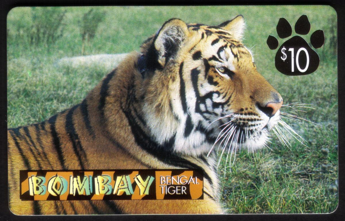 This collectible phone card features a detailed image of a Bombay Bengal Tiger, part of the Predators Plus Series. The tiger is shown in close-up, highlighting its distinctive orange fur with black stripes and intense gaze. The background is neutral, emphasizing the animal’s powerful presence. Above the tiger’s head, the text "$10" is displayed, indicating the card’s value.