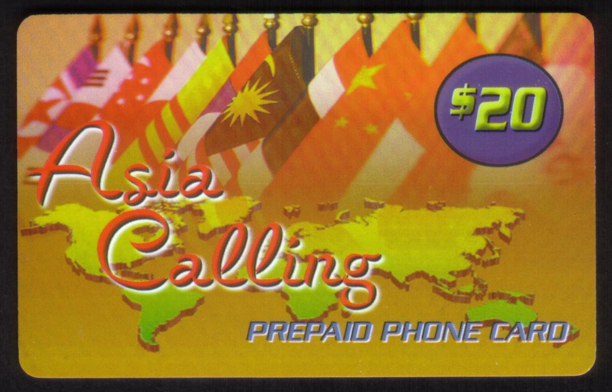 This collectible prepaid phone card features the title "Asia Calling" prominently in stylish cursive font, positioned over a world map that highlights the Asian continent in yellow and green shades. The card includes several colorful flags from various Asian countries arranged in a row above the map, showcasing a diverse representation of national symbols. The flags include those of Malaysia, China, and others.