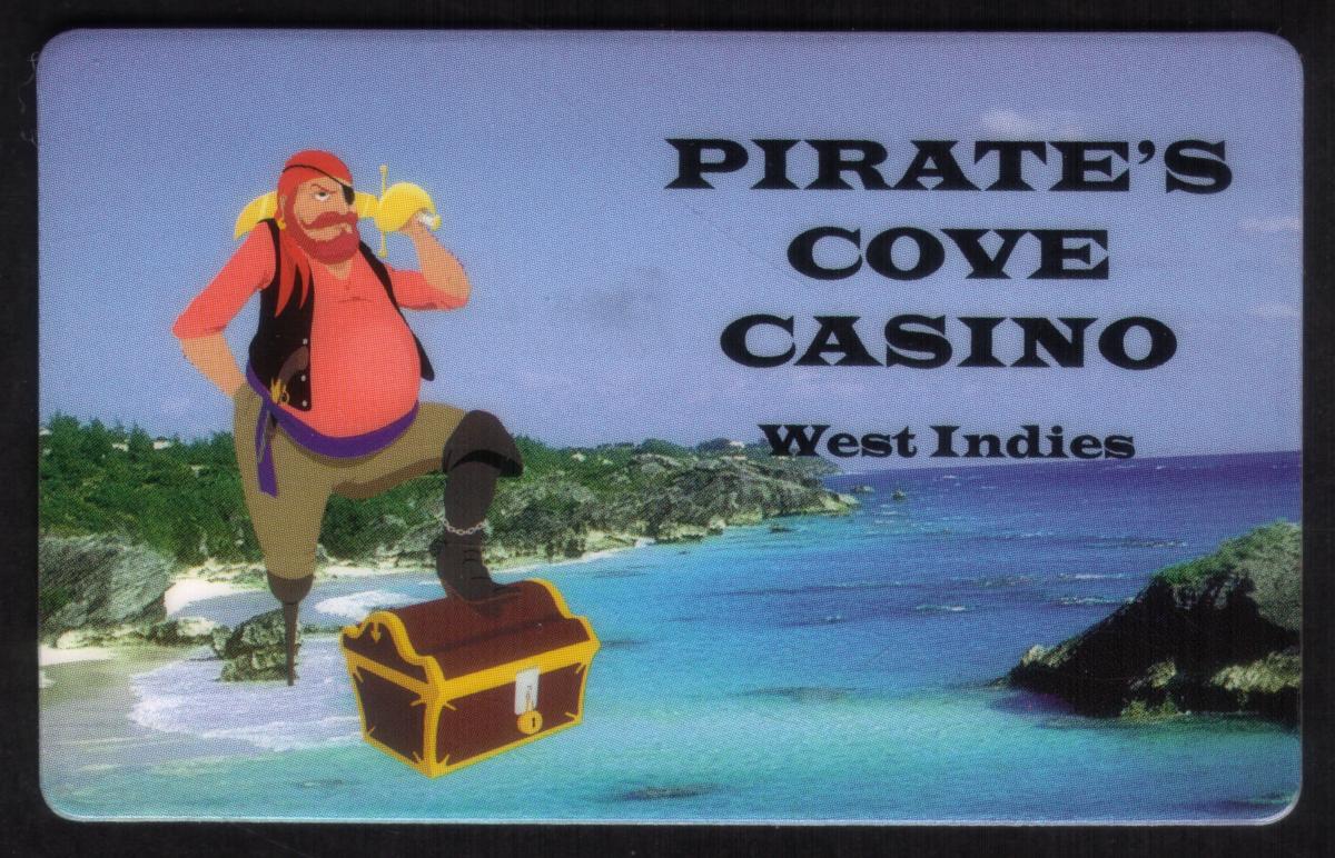 The card is branded with the text "PIRATE'S COVE CASINO" in black, bold stylized font centered in the upper right portion. Below that, "West Indies" is printed in a smaller black serif font. The overall scene evokes a tropical, adventurous pirate theme tied to the Pirate’s Cove Casino located in the West Indies.