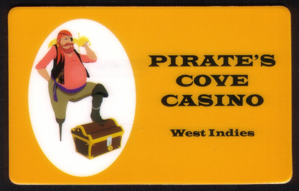 The card features a vibrant promotional design for Pirate's Cove Casino, located in the West Indies. Central to the artwork is a pirate wearing a traditional tricorn hat with a skull and crossbones emblem, dressed in a red coat with gold trim. He holds a treasure chest overflowing with gold coins and jewels, emphasizing the theme of pirate treasure and fortune. The pirate stands on a sandy beach with a blue sky and ocean waves visible in the background, conveying a tropical, adventurous atmosphere.