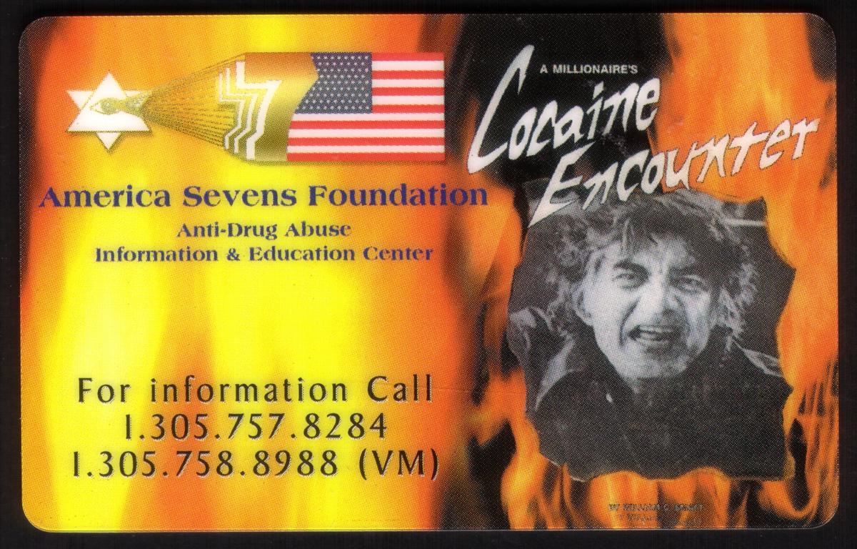 This collectible card features the America Sevens Foundation, an Anti-Drug Abuse Information & Education Center. The design includes a prominent image of a man with a distressed expression, accompanied by the bold text "A Millionaire's Cocaine Encounter" to highlight the card's focus on drug abuse awareness. The card background has a fiery, flame effect that adds emphasis to the urgent message.