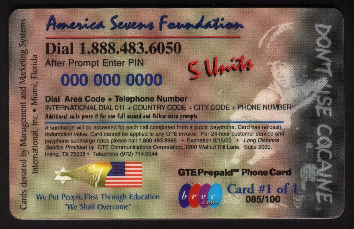 The card includes references to Management and Marketing Systems International in Miami, Florida, GTE Communications Corp, and GTE Prepaid, indicating its network or sponsorship connections. This card serves as a promotional piece intended to raise awareness and educate on the dangers of cocaine use under the America Sevens Foundation initiative.