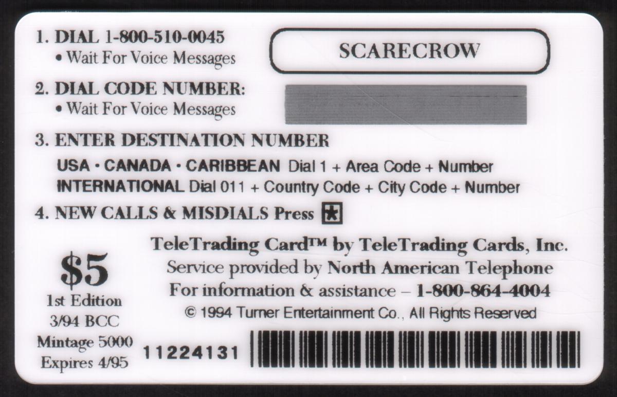 This collectible phone card features a black and white photographic image of the Scarecrow character from the movie The Wizard of Oz. The Scarecrow is shown wearing a wide-brimmed, floppy hat along with his signature burlap costume, complete with rope accents around the neck and frayed edges. His face is painted with makeup to highlight barn-like details, including darkened eyebrows and a triangular nose.