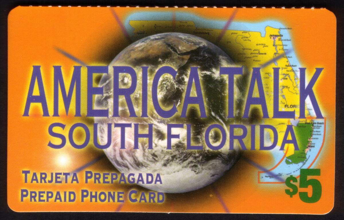 The card includes the text “America Talk South Florida: World Globe & Florida Map (Paper)” which identifies the geographic focus and theme. The mention of Insatel connects the card to this entity, indicating that it is associated with their products or series. The design uses clear, easy-to-read fonts to emphasize the geographic elements, and the overall visual presentation highlights both the global and regional maps.
