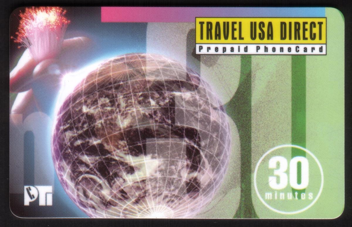 In the upper right corner, a yellow box contains the text "TRAVEL USA DIRECT" in bold black letters, with the words "Prepaid PhoneCard" in smaller black font just below it. To the right of the globe, a white circle encloses the number "30" with the word "minutes" below it, indicating the card’s prepaid call time. On the bottom left, there is a stylized "pr" logo in white.