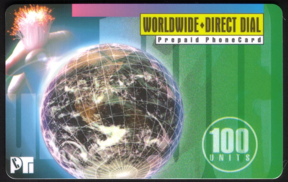 The top right corner of the card displays a yellow and black label reading "WORLDWIDE • DIRECT DIAL" followed by "Prepaid PhoneCard" in smaller black text beneath. The bottom right corner shows a white circle containing the denomination "100 UNITS" indicating the card's prepaid credit. At the bottom left corner, a stylized logo consisting of the letters "PT" is present. The card's overall color scheme includes shades of green, blue, purple, and hints of pink, reinforcing a theme of technology, telecommunications, and global reach.