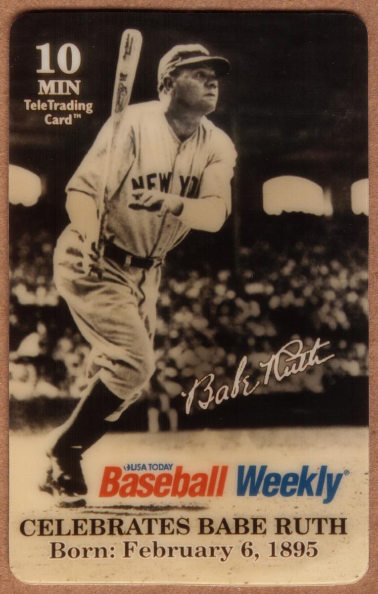 The card is issued by TeleTrading Cards Inc. and is associated with USA Today's Baseball Weekly Celebration. It is a collectible item celebrating major figures in baseball history, focusing specifically on Babe Ruth’s enduring legacy as a central figure among sports celebrities and baseball players. The design integrates references to sports legends and baseball bats, highlighting the importance of Babe Ruth in the sport’s evolution.