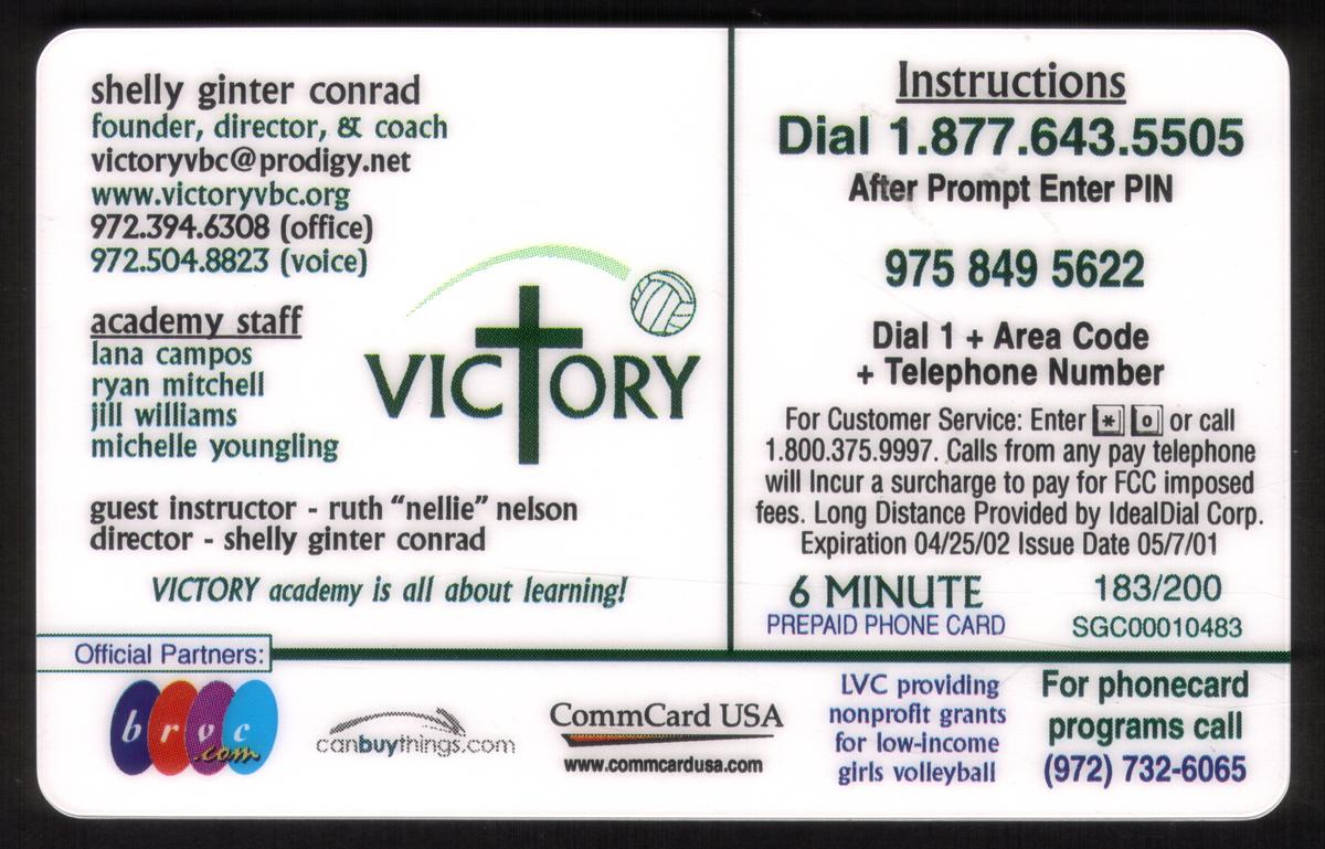 These three collectible phone cards honor the Victory Volleyball Club, a nonprofit organization focused on girls volleyball, promoting sportsmanship, faith, and skill development. The first card features the Victory Player’s Oath, displaying volleyball players Rose Magers, Flo Hyman, and Danielle Scott in action poses over a volleyball net background. The oath reads, "I will listen to all coaches. I will learn from everyone. I will practice and play to the best of my God-given ability, and I will respect myself, coaches, teammates, and parents!" The card also credits Shelly Conrad as Founder & Director and notes Victory Volleyball Club's mission to provide nonprofit grants for low-income girls’ volleyball.