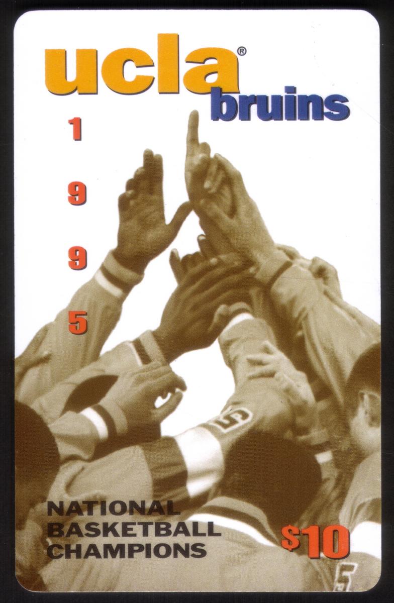 This collectible card features a dynamic basketball image showcasing players from the UCLA Bruins, the 1995 NCAA National Basketball Champions. The card highlights collegiate basketball, with a close-up action shot of players’ hands reaching for the basketball, emphasizing the intensity and skill of NCAA basketball competition. The UCLA Bruins logo is visible, reinforcing the card’s connection to college basketball and the university’s prestigious basketball program.