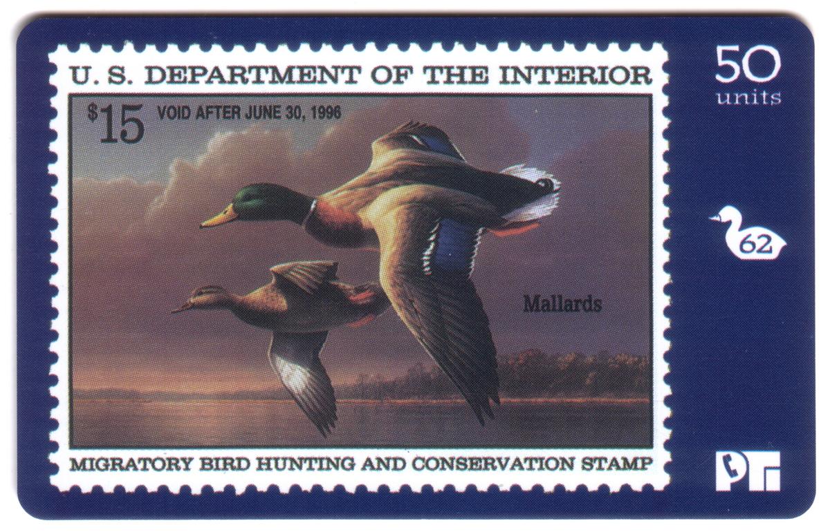 This item is a prepaid international telecom card featuring a duck hunting permit stamp design. The design focuses on wildlife, specifically mallard ducks, representing hunting permits used for duck hunting. The card highlights its collectible nature related to birds, wildlife, and philately. The card’s primary color scheme includes shades of green, blue, and natural earth tones that complement the outdoor setting of the flying mallards.