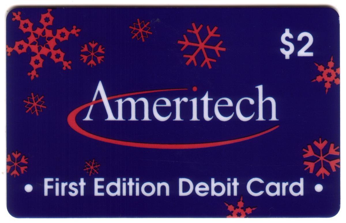This card is identifiable by the presence of “Ameritech” branding and the $2 value, with no other graphic elements or characters on the front. The artwork emphasizes a seasonal motif connected to snow and winter, presented in a polished, formal style suitable for a debit card issued by Ameritech.