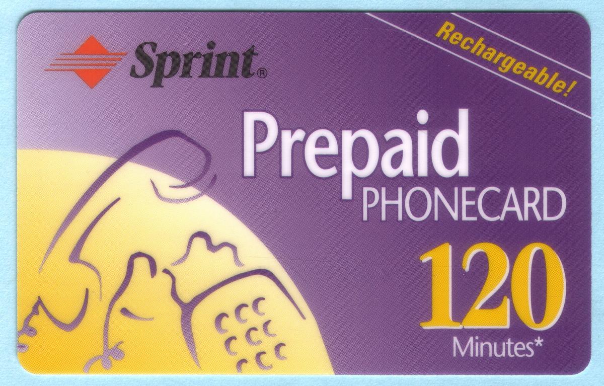 This collectible phone card is a Sprint prepaid rechargeable card that offers 120 domestic USA minutes. The card prominently features the Sprint logo in red and black at the top left corner. The text on the card clearly states "120 Domestic USA Minutes Prepaid Rechargeable." The card’s validity is marked with the expiration year 2003.