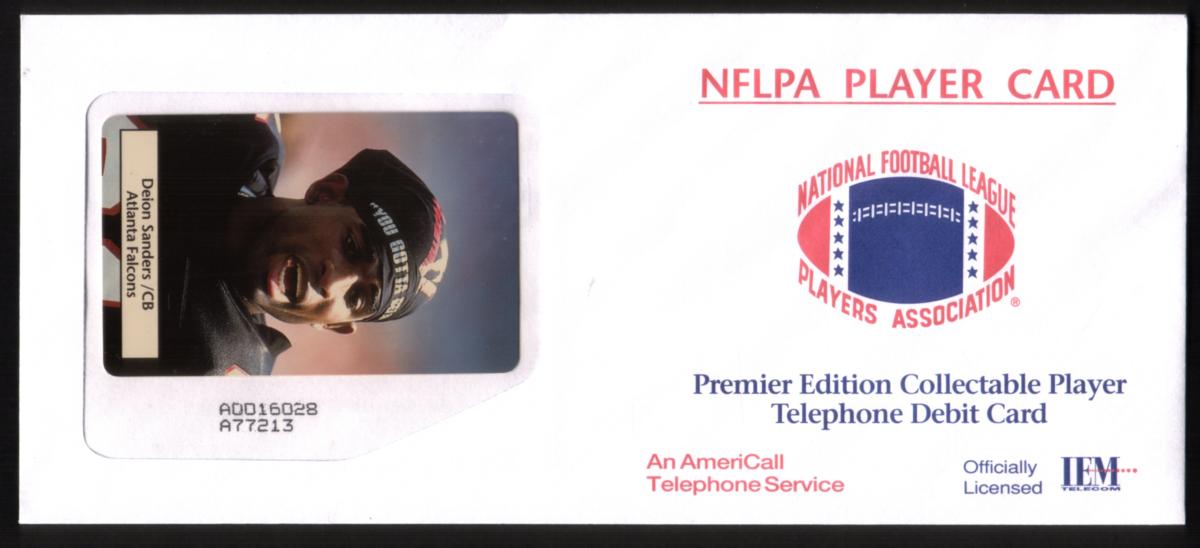 The design centers entirely on Deion Sanders’ expressive athletic image, capturing a moment that reflects his competitive nature. The card is enclosed in an envelope, indicating it is presented as a collectible phone card preserving the athlete’s legacy in football.