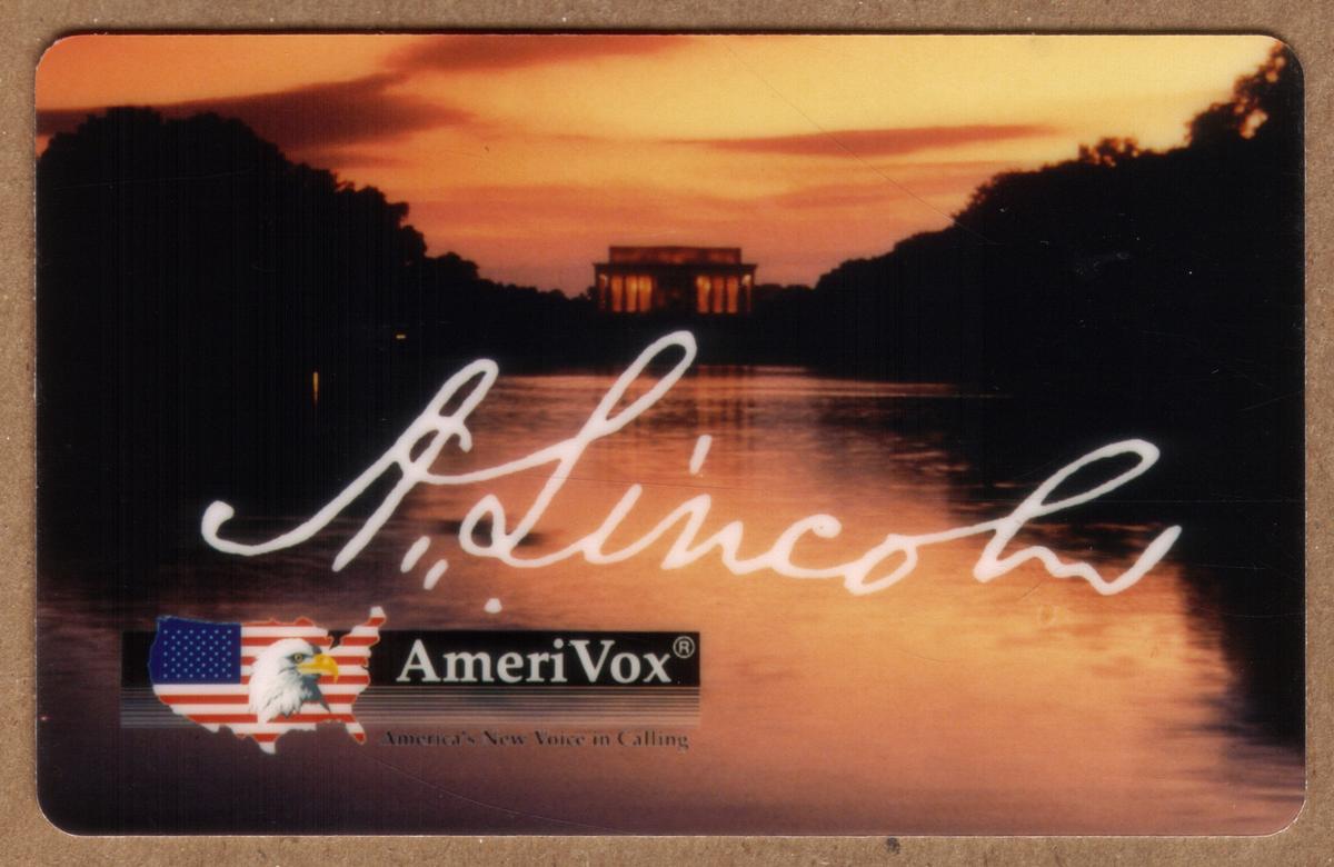 Additional textual elements include the denomination "$10" and the label "AmeriVox," indicating the issuing entity. This collectible relates specifically to American historical sights, architecture, and Abraham Lincoln, making it a tribute to significant moments and symbols in U.S. history.